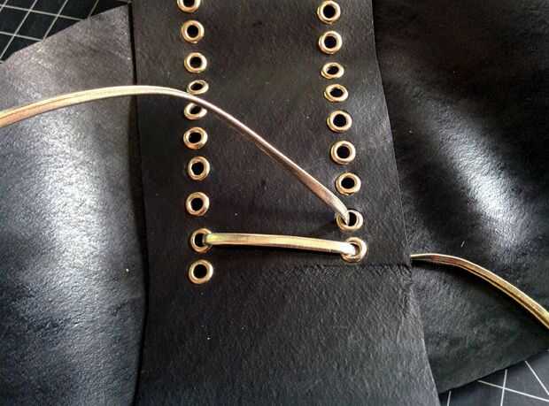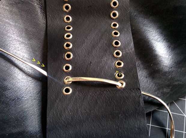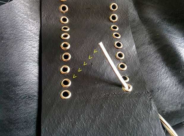 - Agarrar la cuerda de cuero del faux y colocar detrás de la primera anilla en la parte superior.