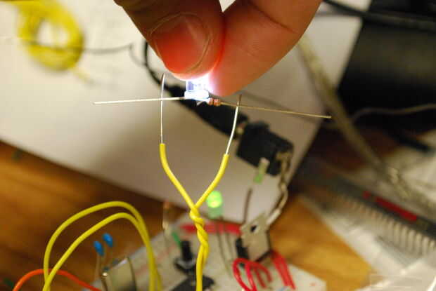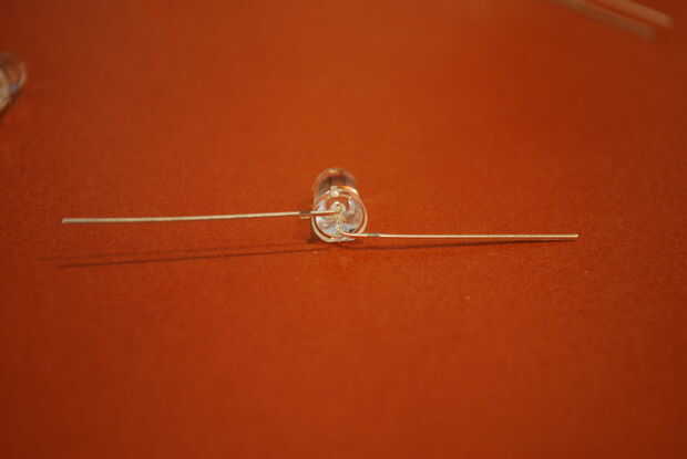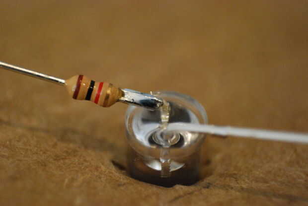 -Mantenga el cable corto de la resistencia junto al cable cortado del LED y virar a ellos junto con un poco de soldadura (Foto 5)