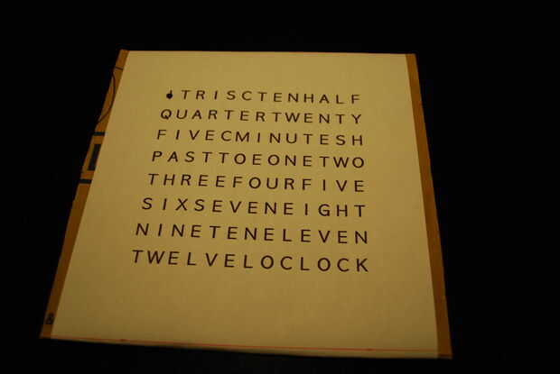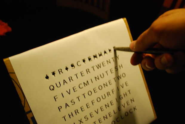 Decidí tomar un 9 "x 9" pedazo de cartón y perfore los agujeros para cada LED. Imprimí un patrón con las letras (puede usar el mismo archivo como la transparencia, o invertir los colores para ahorrar tinta) y lo centrado en la cartulina con cinta. Entonces tomó un punzón y perfora un agujero a través del centro de cada letra que se enciende (Foto 3).