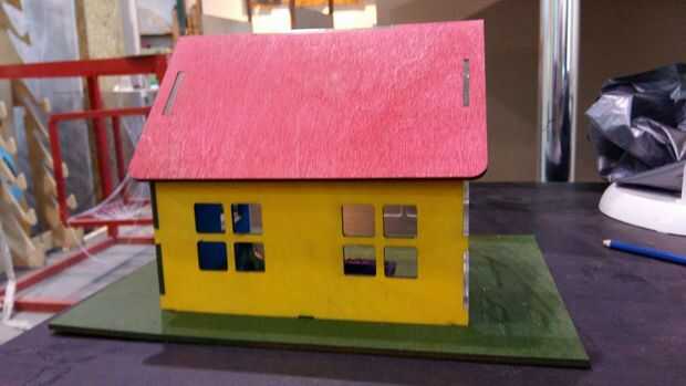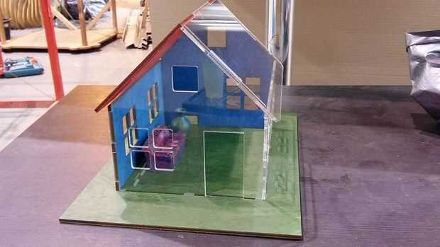 Nuestro primer paso fue crear un modelo. Utilizamos bien conocidos programas de 2D y 3D (SolidWorks) de modelado para dibujar la casa donde colocamos las zapatas. En primer lugar, hicimos una pequeña madera, cortado con un lazer. Entonces nos dimos cuenta de una más grande. Finalmente hicimos la casa final en plástico y en madera para que podamos ver a través de saber si las luces están encendidas o no. Las piezas fueron diseñadas diferentemente en cada lado según el material que debían estar conectados. Se adjuntan los planos de la casa de todo modelo.