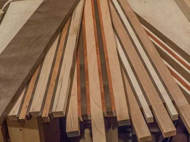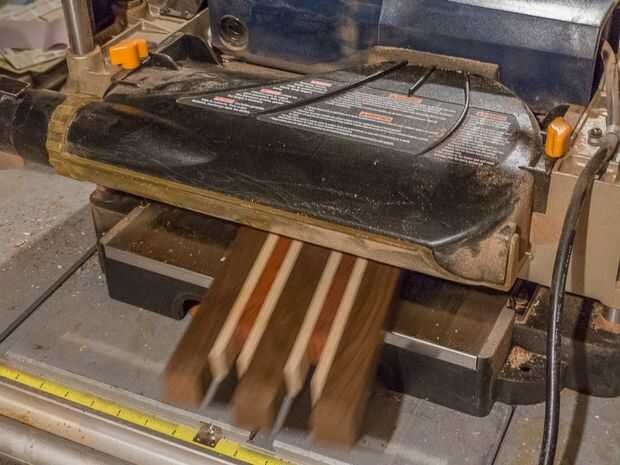 El tablero ahora es estar dispuesto a plano. Comenzar la planificación con la cara que destruyó en la fase de pegar hacia abajo. De esta manera, tiene una superficie relativamente plana del montar a caballo en la cama de la cepilladora. Esto es especialmente importante si usted ha utilizado materia prima madera de 4/4 que es notorio no coinciden en el grueso. Plano de la parte superior plana, entonces voltee y plano del otro lado plano. Maderas adornadas (como de pájaro de arce de ojo, acolchado de arce o abedul de llama) deben cepillar con cortes poco profundos para evitar desgarros.
