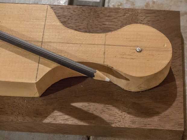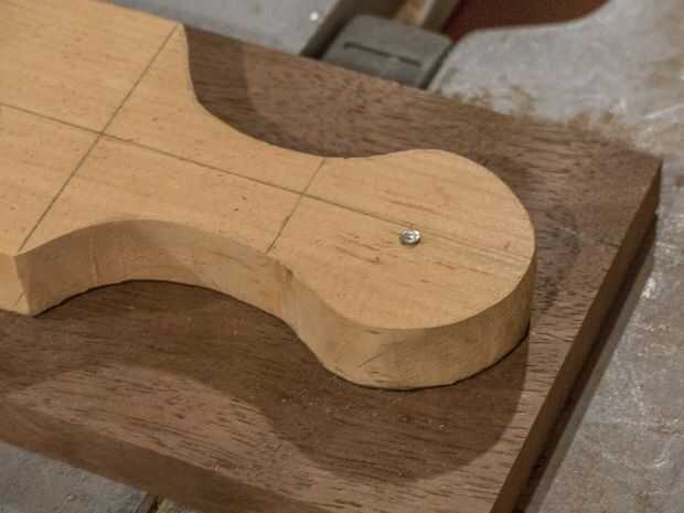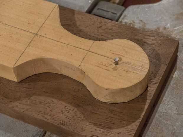 Mi plantilla de tienda tiene un clavo conectado permanentemente a él. Alinee la plantilla en la posición derecha, por lo que la revelación de la madera en la parte (C) es exactamente el mismo en ambos lados de la manija. Una vez en su lugar, doy la uña un fuerte golpe con un martillo. Esto tiene el doble beneficio de sosteniendo la plantilla en su lugar y marcar la ubicación del taladro que te perfore más adelante. Una vez que la plantilla está en su lugar, yo Marque el contorno de la manija. Note que para maderas oscuras, es más fácil de marcar con un lápiz de color blanco.