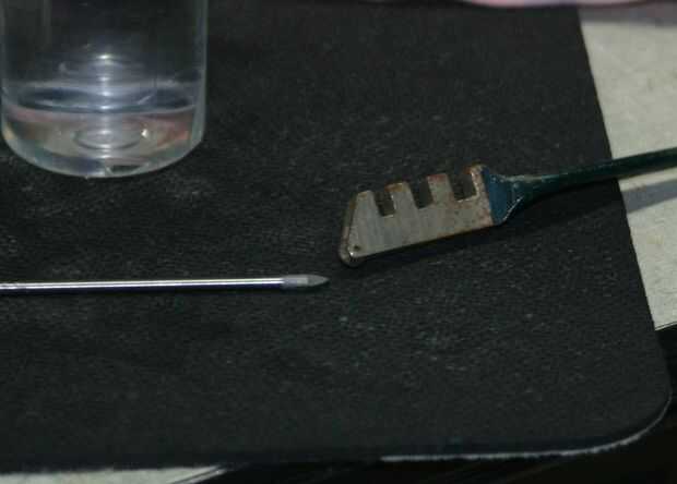 -Cristal-broca de corte. Usted puede conseguir probablemente caros si te apetece perder dinero, pero usé un 1/8" horquilla punto de bits de un conjunto de ocho piezas de Puerto carga $8. Estos pedacitos de la espada son, básicamente, una pequeña lanza de carburo de tungsteno puro, haciéndolos muy muy muy duro, pero también algo frágil y propenso a problemas de calor. A dirección más adelante.