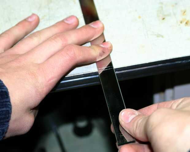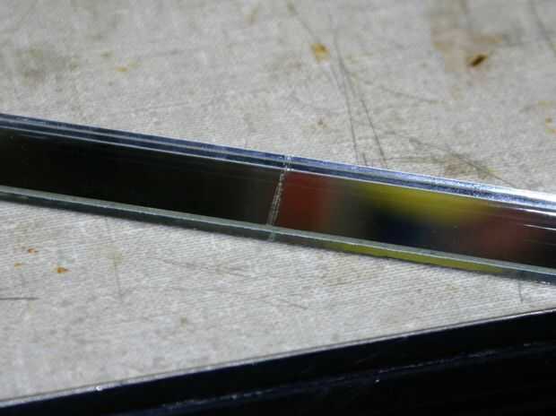 Coloque el espejo en el borde de su mesa/escritorio/mesa de trabajo para que la línea anotada es alineada con el borde. Mantenga el borde saliente y empuje firmemente hacia abajo. El vidrio debe pop off limpiamente, y llegar a sentir orgulloso de ti mismo por haber conquistado la fuerzas oscuras de la sílice cristalina.