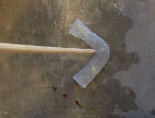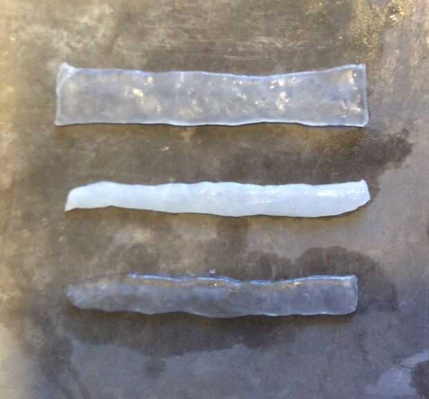 1. cree tres tiras de plástico, para ello, corte tiras de blob plástico y aplanar hacia fuera. (Cuando el plástico comienza a girar a la blanco que significa que es endurecer otra vez y no es fácil trabajar con. Cuando esto sucede, sólo pone de nuevo en el agua hasta que se transparente y flexible).