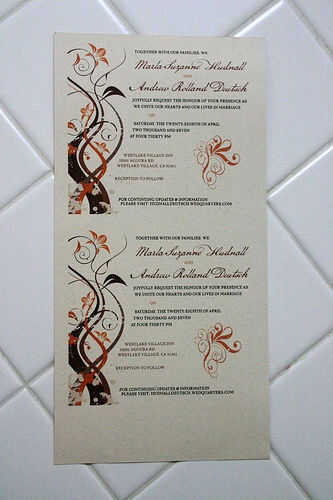 Ahora que estamos en nuestra sección de elementos. Para nosotros, optamos por tener cuatro partes diferentes a la invitación; La invitación, tarjeta del hotel, mapas y direcciones, tarjeta de RSVP. Las tres primeras partes fueron todos cuadradas 5.5x5.5 de medición "y fueron impresos en nuestra impresora doméstica de HP de inyección de tinta en los 12.5x6.25 «stock de tarjetas y luego cortar a la medida. Como se indicó anteriormente, se adquirieron imágenes originales de istockphoto.com y fuentes de veer.com. Gráficos entonces fueron creados en el software de Adobe InDesignCS3.