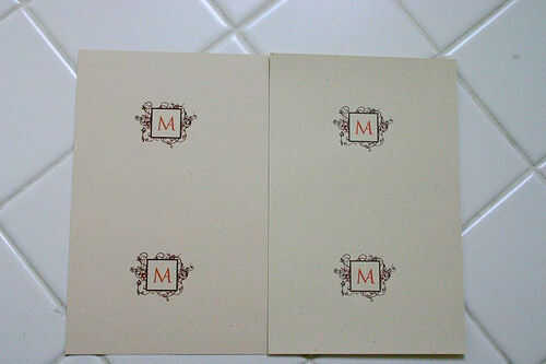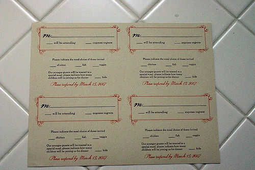 Tarjetas de RSVP se imprimieron en el 8.5x11 "tarjeta de existencias. Las cartas reales medición 5.5x4.25 "y por lo tanto caben 4 en una hoja. También a continuación volcó el papel e impreso nuestro monograma en el otro lado que era una fusión de nuestras iniciales juntas, un am' y una 'A'.