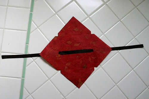 Mientras la cinta del satén se redujo a 24" de longitud y alimentado a través de los agujeros precortados en el papel de la Mora starfold, reflejo del lado del papel abajo. (Dependiendo de tu arco atar habilidades, pueden necesitar ser un poco más largo).