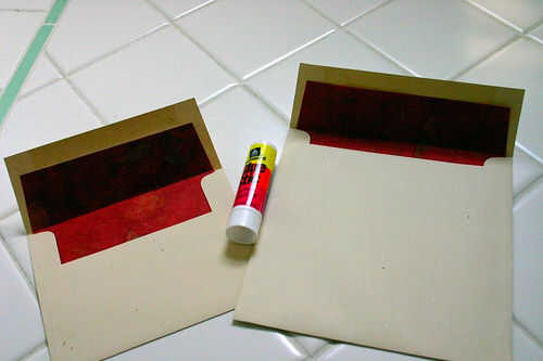 Usando el palillo del pegamento, inserte sus forros corta sobres cada sobre. Doblar del trazador de líneas para aplicar el pegamento y luego presione suavemente en el interior de la envolvente. NO UTILICE UNA PISTOLA DE PEGAMENTO. Sé una novia que ha sobres fueron cayendo una parte, por lo que decidió pegamento los arma juntos.