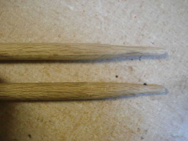 Ahora afilar los extremos de los palillos. No hacen agujas afiladas, sólo les afilan suavemente. Comencé mi disminuyendo alrededor de 1,5 pulgadas a la longitud de la espiga, pero no importa. Sólo los extremos de los palillos a su gusto la forma, pero tenga cuidado de no quitar demasiada madera. Recuerda, si te equivocas, siempre puede cortar otra longitud de espiga y vuelva a intentarlo.