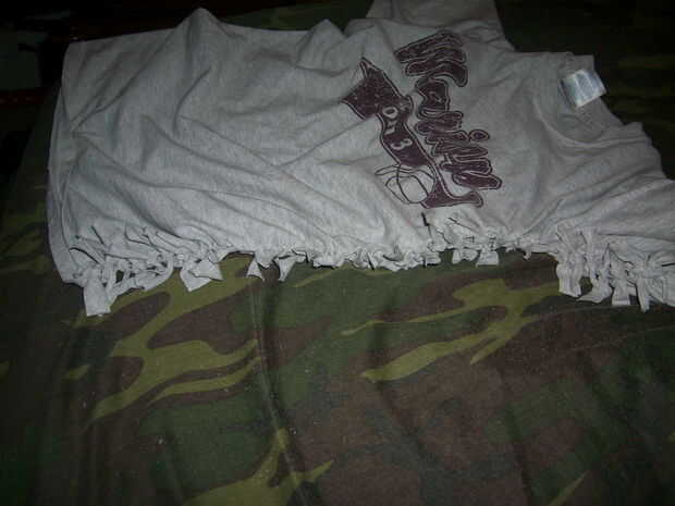 para este proyecto se necesita encontrar 3-4 viejas camisetas. También se necesitan tijeras y una pistola de pegamento caliente.Paso 1: Cortar las camisas por la mitad así que usted puede cortar tiras largas de la camisa.Paso 2: Después Repita el pas