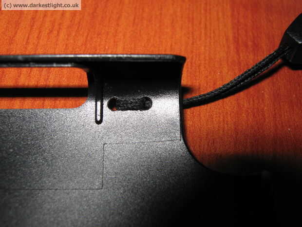 Coloque la parte de la cadena de la cuerda por el orificio 1 y luego vuelve a salir el 2 º agujero. Asegúrese de que no hay ningún cruce de las cuerdas dentro de la caja (Foto 1)
