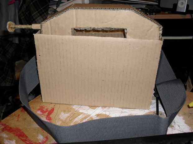 todo lo que hice aquí era sacó una correa de un bolso viejo (no mi tía!) y alimentado a través de una ranura en uno de lo laterales paneles befre pegados juntos la caja. Si tienes suerte suficiente para tener algún cable de olf mentira cerca Conecte un extremo a su teléfono y un extremo a su paquete de batery... (No lo hice... por lo que tendrás que usar tu imaginación) Pintar el teléfono y salir a la carretera (también he añadido unos detalles con rotulador.. .porque soy perezoso