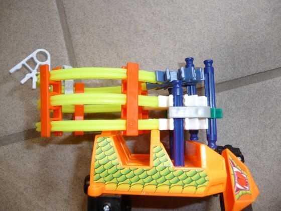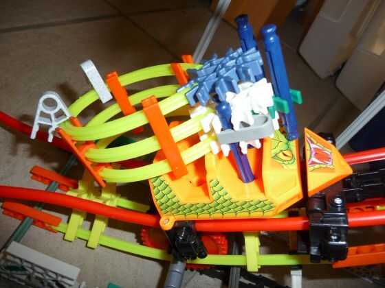 el carro de montaña rusa toma la bola y lanza girando la pista hacia abajo mientras que todavía va hacia adelante. (no sé cómo decirlo más encantador): y en la elevación de ambas vías se funden detrás otra vez.