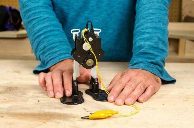 Si no hay ningún 'pies' para el juguete a caminar en su propia, sería mejor montar la parte móvil del juguete en un bloque de madera con clavos para la estabilidad y la facilidad de conexión.