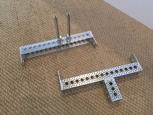No es de vital importancia que los "pies" se ven exactamente como las fotos. Sólo tienen que proporcionar una base de apoyo para que el robot puede equilibrar en cada pierna. Cualquier material puede ser utilizado. Aquí, 12 pulgadas Actobotics canales proporcionan el ancho de cada pie. El pie de atrás tiene un canal adicional de 3 pulgadas para proporcionar profundidad y dos pies hacen uso de soportes planos duales para proporcionar estabilidad adicional. El pie delantero utiliza 6 pulgadas mini-canales que eventualmente conectará a la Asamblea de la pata delantera.