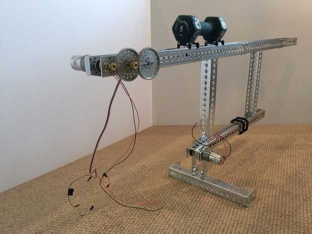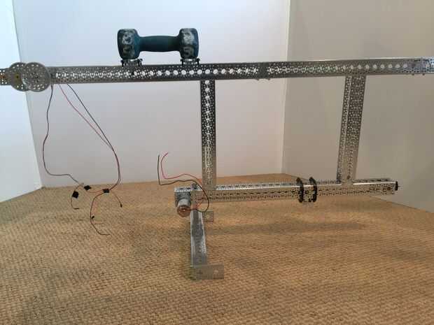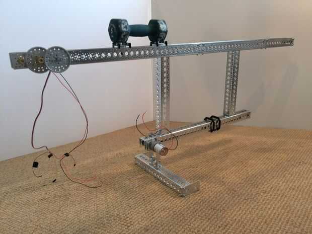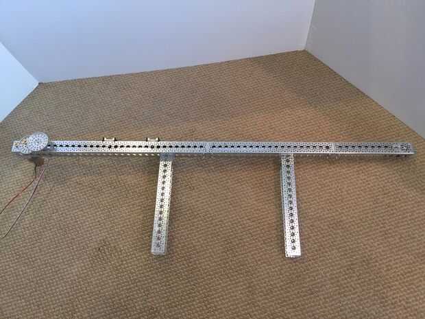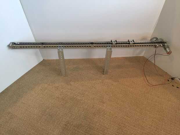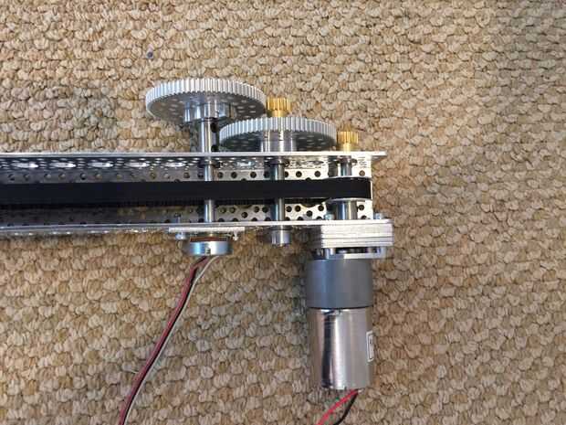 El cursor superior, responsable de mover el contrapeso hacia adelante y hacia atrás, se conecta a la Asamblea de pata delantera a través de dos canales de aluminio de 12 pulgadas. Puesto que el control deslizante superior es tan largo, requiere dos pasos de engranajes para conectar el otro potenciómetro de 5 k ohmios al eje del motor. (De lo contrario, el potenciómetro se quedaría sin viaje.) Otra vez, este potenciómetro informa de la posición del contrapeso para el programa. Dos soportes de deslizador de plástico negro se utilizan en el cursor superior para dar cabida a la barra de 5 lb.