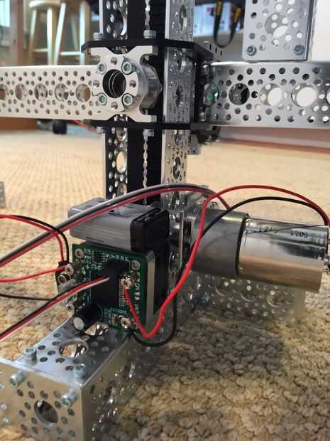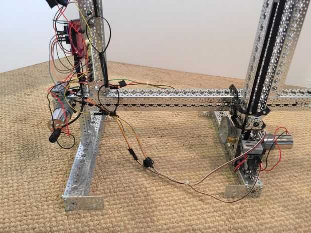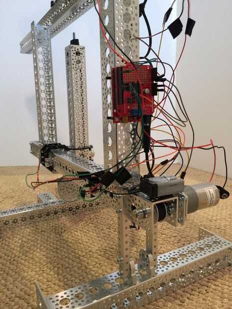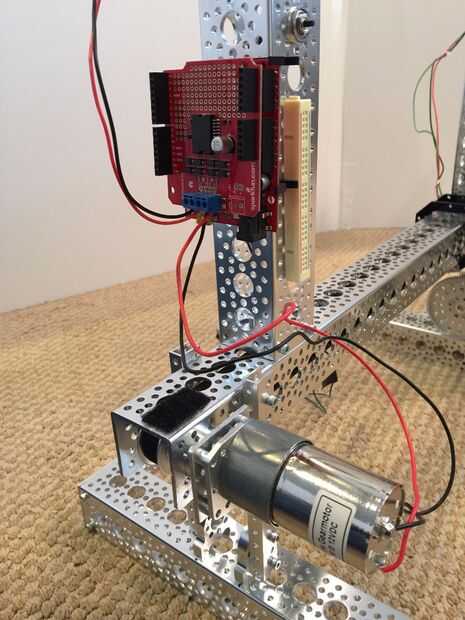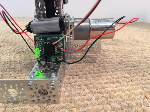 El RedBoard es el cerebro de la operación, ejecutar el programa que controla los movimientos del robot. El controlador Ardumoto recibe órdenes desde el RedBoard y a su vez proporciona las señales de poder y unidad para los motores de los reguladores de pata y contrapeso frontales. El RedBoard también envía señales de control al controlador de HB-25 que son necesarios para subir y bajar el cursor vertical. Cableado adicional es necesario para enviar el voltaje de entrada a los potenciómetros y los interruptores de límite, así como para llevar señales de salida de los componentes a la RedBoard. 9V baterías de energía los componentes RedBoard, Ardumoto y HB-25.