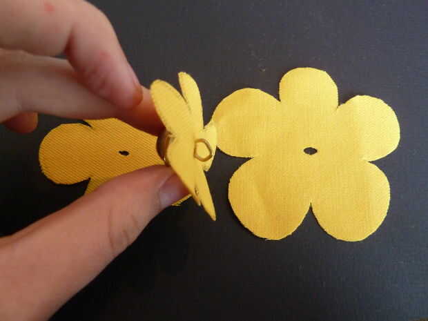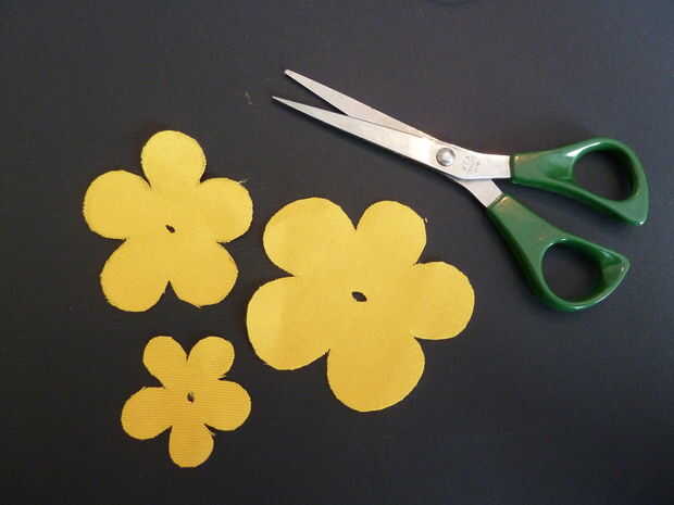 Primero, corte a tejido de flores en tres tamaños diferentes. Hacer tres flores para cada tamaño, que es la cantidad que usted necesitará hacer una guirnalda. Luego, realizar una pequeña perforación en el centro de cada flor. Hacer tres montones de flores, con en cada pila una flor pequeña, mediana y grande.