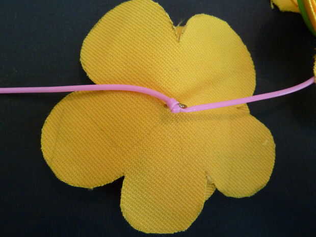 Coloque las pilas de flores a la cuerda de scoubidou haciendo un nudo a los anillos de las campanas.