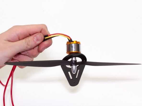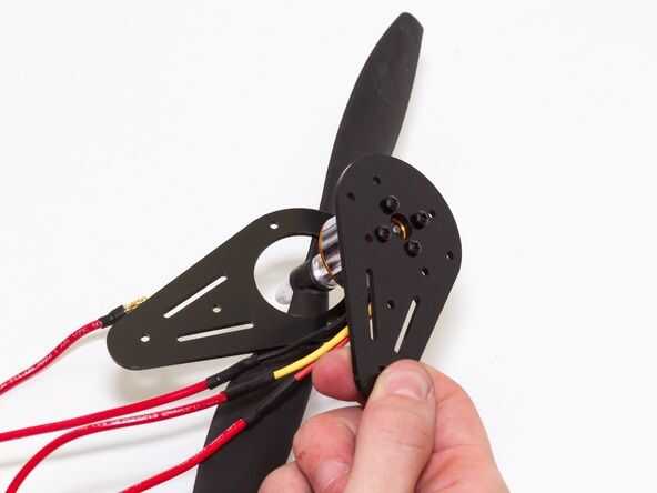 Fije los soportes del motor uno al otro con espaciadores de plástico, arandelas y pernos. No te olvides de Deslice los 3 cables del motor abajo el boom antes de apretar todo para arriba.