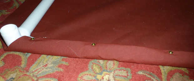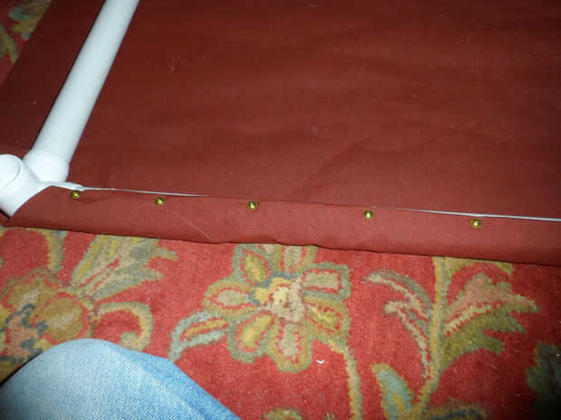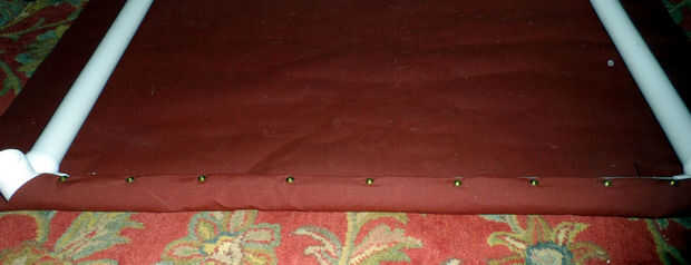 Colocar a la tela en el bastidor va rápidamente. Lo importante es trabajar enfrente de lados uno tras otro y no a trabajar alrededor del borde. Hice los dos lados largos y luego los dos lados cortos. Sujete a la tela y tire a través de la tubería y línea la tela doblada de modo que esté centrado en el tubo y fíjelo con un tornillo. La primera de ellas debe ir en medio de la cara. La colocación no necesita ser exacta. La primera imagen muestra la posición del tornillo en el tubo y la segunda foto es un cierre de tornillo que utiliza. Los dos tornillos van en los extremos de la tela. Asegúrese de que no atornillar a través de los codos! Luego coloque un tornillo entre los tornillos como en la tercera imagen. El tercer cuadro tiene notas que muestran las ubicaciones para los otros tornillos. La última foto muestra lo que debe. En el video que comenzaron en el centro y trabajaban su camino hacia fuera a los extremos - no hice eso porque era solo de trabajo.