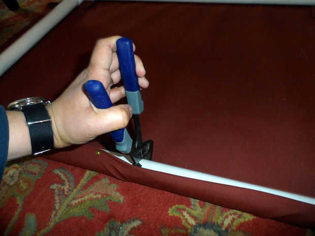 La secuencia para la colocación de tornillos es el mismo para este lado, como lo fue para el lado opuesto. Una diferencia importante tienen lugar después de la colocación del primer tornillo. Después de colocar el primer tornillo es hora de estirar a la tela. Utilizando las esclusas del canal agarre el tubo cerca del centro y deslice delante de usted. Esto tirará la tela enseñó. Luego coloque un tornillo en cada extremo y luego añadir los otros como en el otro lado.