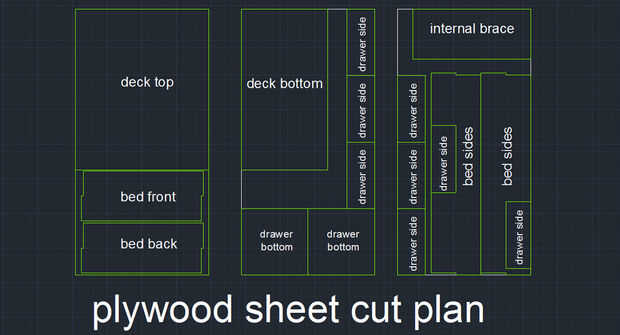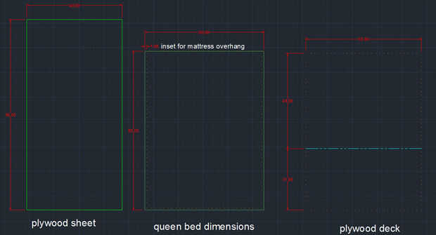 Utilizando software de CAD para el diseño de la estructura, iniciado por la medición de las dimensiones de mi colchón de tamaño queen. Quería una cubierta continua de mi colchón mentir encima de, puesto que el colchón era más grande que una hoja de madera contrachapada abarcó más de 2 hojas.