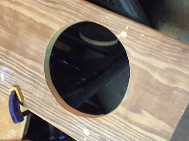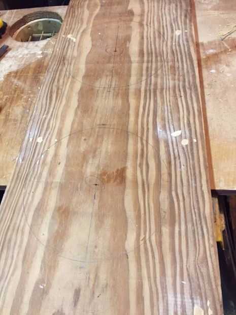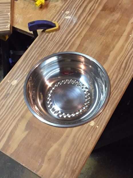 Que dividir el espacio de 8 1/2" y un centro de marca por lo que pude cortar el agujero para cada tazón de fuente. Usé un compás de 4" para marcar el corte mis bolas. Cada contenedor tiene un 3/8" labio del borde el comienzo de la taza y quería el 8 1/2" tazón de fuente a sentarse sobre la plataforma, pero también tienen una pequeña sala de ondulación para el tazón de fuente podría ser fácilmente removido y limpiado. Corte los orificios de 8" me dio que necesita la habitación. Usé un taladro un agujero piloto y una sierra de calar a áspero corte los orificios desde la plataforma. Entonces usé un papel de lija para redondear los bordes de cada orificio.