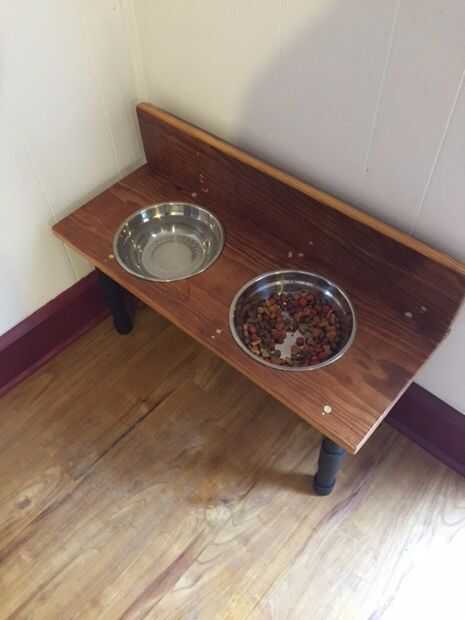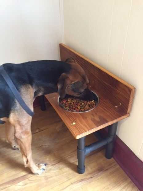 Coloca la nueva plataforma en su ubicación final, agregó los tazones de fuente y llenó para arriba. Otis Puppy tomó a su nueva plataforma de plato de comida en ningún momento... gracias a un par de pedazos de pepperoni coloqué bajo su comida normal.