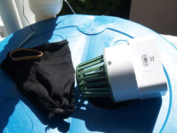 Es compised el filtro de un canalón de PVC 4" convertidor en el difusor verde 4" que es realmente invertida en esta aplicación, por lo que lo estoy usando como un colador en su lugar de forma.  Dentro de la coladera va el tubo de calcetín diseñado para filtrar sedimentos del tubo corrugado utilizado en aplicaciones.  Cortar aproximadamente una 12" longitud del calcetín y ató un nudo en un extremo y goma lo había congregado alrededor del exterior del convertidor.  Mis canales son evaluados por lo tanto no que mucho se mete en distintas partículas más pequeñas.