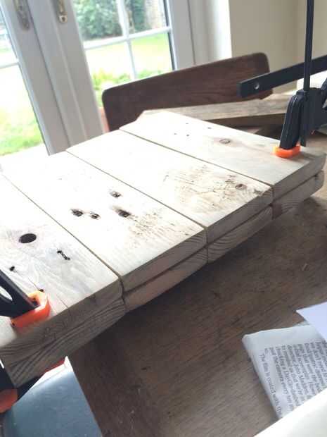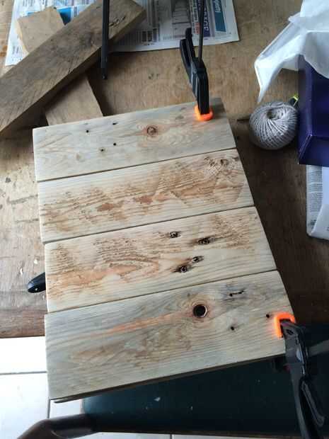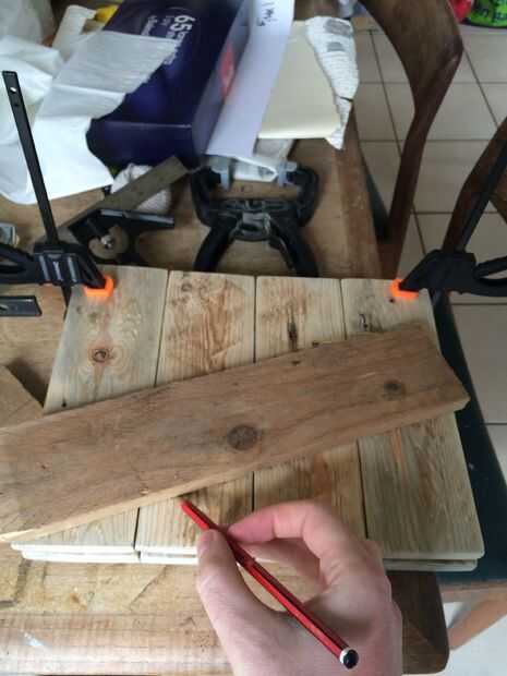 Lugar la madera de nuevo con las dos marcas nuevas y luego fije con abrazaderas de todo bien en un banco de trabajo listo para cortar, vamos a utilizar la madera como guía.