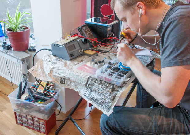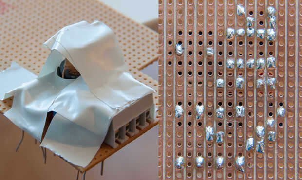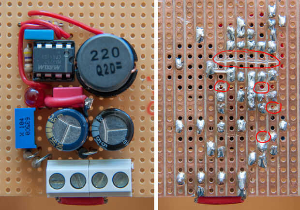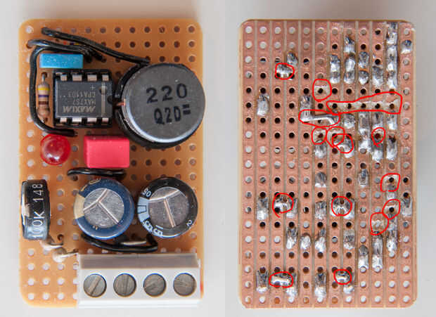 Debe tener alguna experiencia en soldadura. Placas de prototipo pueden ser un poco complicados. Suelde todos los componentes a la vez en este paso. Comprobar que todos los componentes están en lugar correcto y cortan los cables lo más cortos posible.