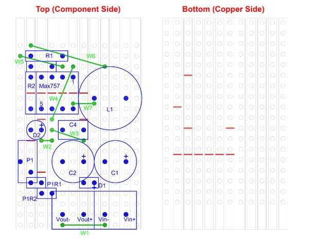 Comencé a colocar todos los componentes como inteligente y espacio más eficiente posible. Los carriles conductores de cobre deben utilizarse tanto como sea posible, dos la prioridad es cortar los carriles y prioridad tres es agregar los cables externos. Con un diseño optimizado con cables extras como pocos como sea posible es la parte más difícil (tal vez hay software que puede hacer eso). Que podrían evitarse si se utiliza un circuito real o un diseño más inteligente. Si te don´t quiere hacer su propio diseño, entonces sáltese este paso y copiar mina. Pero hice demasiado apretados en algunos lugares y era un poco complicado poner los cables en el lugar. Mi recomendación es que lugar D2 y C4 todo encima (en la vista superior) un agujero en la dirección de arriba. Resultados en más espacio para W3, W2 y W1 colocar mejor. Más tarde traté de que la modificación y hace otra, véase el cuadro.