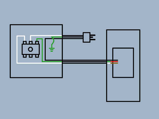 Usé un cable de la computadora para ejecutar desde la pared de la caja del interruptor. Simplemente el corte del final femenino y había conectado al interruptor. Usé algunas cableado de la casa estándar 16 calibre para ir del interruptor de la luz. Un cuarto cable que va desde la caja del interruptor para la luz habría sido útil para un suelo. El interruptor DPDT vino de Home Depot. (Esto es importante porque más interruptores DPDT no son valorados lo suficientemente altos como para esto. Asegúrese de que la calificación es de 15 amperios y 120 voltios menos.)