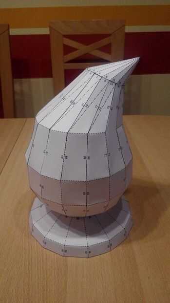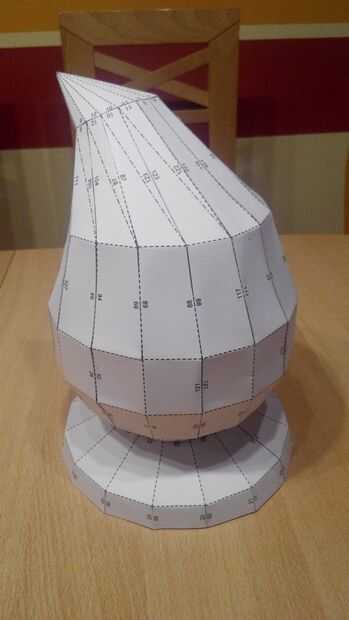 Primero crea la forma con Blender (encontrar la mezcla adjuntas) y exportado como DAE, ya que esto las costuras el formato más preciso que puede ser utilizado en otros programas 3D. Por lo menos con Pepakura así fue. Esto es lo que usé (Pepakura archivo attatched) para convertir un objeto 3D para imprimir piezas que luego pegan (ver dos fotos).
