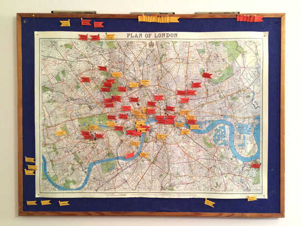 Originalmente creada como una herramienta para ayudar a visualizar mi ciudad nueva (se trasladó desde San Francisco a Londres), este mapa de aventura relata los lugares que he estado y los viajes que todavía tengo que tomar. Banderas rojas son cosas que he hecho, la marca amarilla los lugares que me han dicho debe ir o lugares ver y quieren recordar.