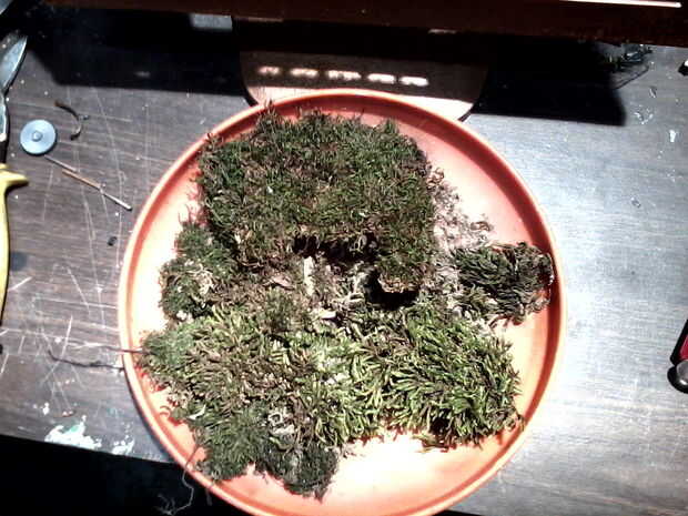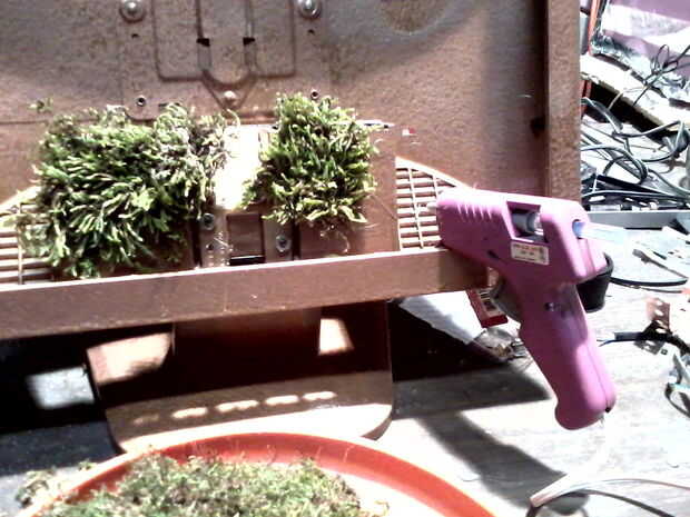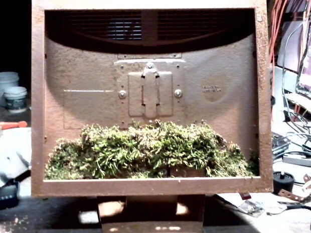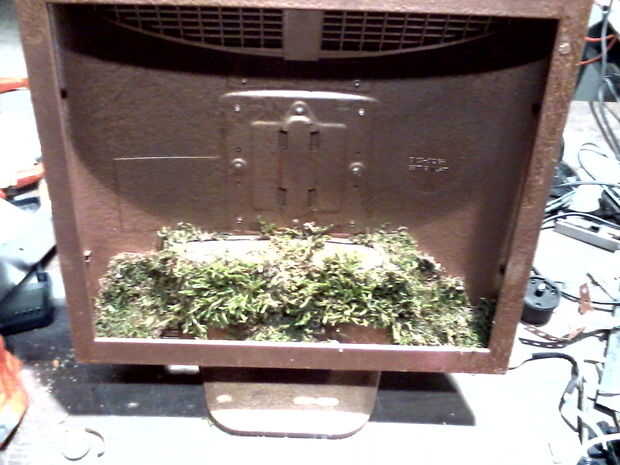 Vuelva a poner el caso juntos necesita algunas tuercas de 1/4 para sujetar la base a la parte posterior entonces ir hacia fuera de lado y recoger algún musgo o si usted está tan inclinado puede comprar musgo en un centro de jardín o The home depot. Pegamento caliente el musgo a lo largo de la parte inferior de la caja del monitor y dejar la demostración caso lanzó en lugares está bien por mí.