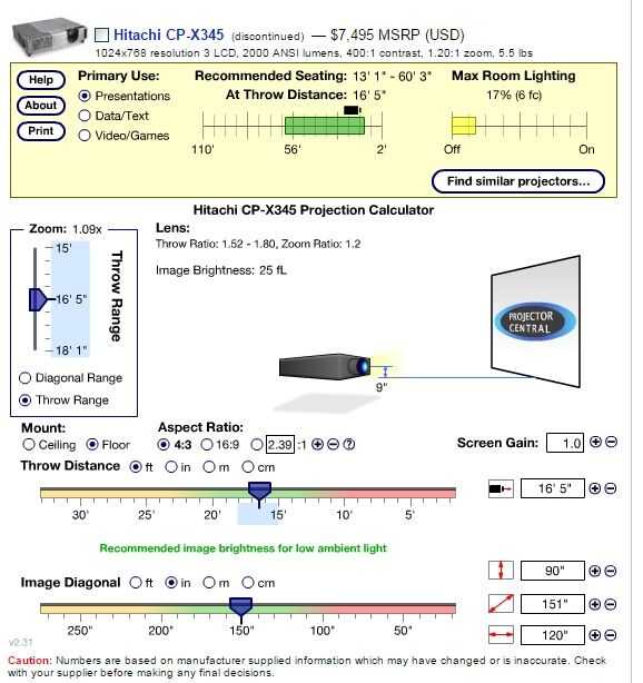 El otro es usando la calculadora de proyección de proyector central*, pueden buscar su modelo de proyector y haga clic en 'Tiro Dist' en las especificaciones del proyector, en el lado derecho de la página. Usted puede ver cómo se ve con mi proyector y viejo HITACHI CP-X345 en la imagen.