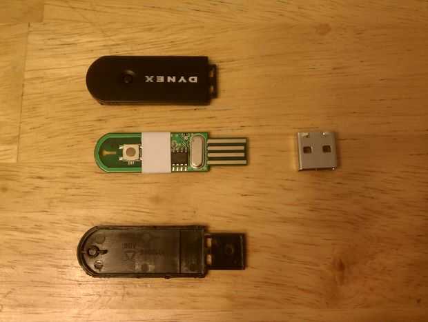 • En su nueva área de trabajo abrir el dongle. Si su atornillado juntos simplemente desenroscarlo, pero la mayoría será probablemente ser pegada en cuyo caso tienes que dividir con un destornillador pequeño o una hoja de afeitar.