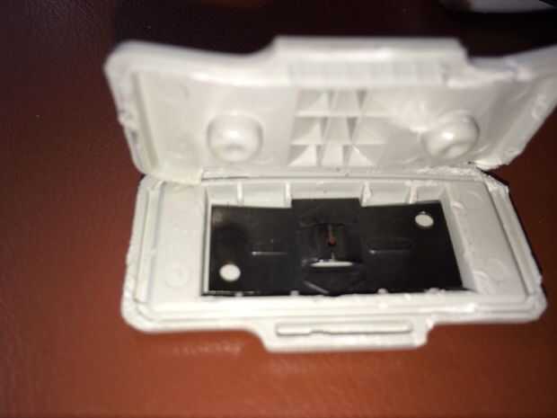 En la parte superior o la pieza que contiene la tinta, levante con cuidado el plástico aparte por la seem con el cuchillo de carne o un destornillador fino de cabeza plana. Tenga cuidado al aplicar presión para no romper las cápsulas de la tinta.