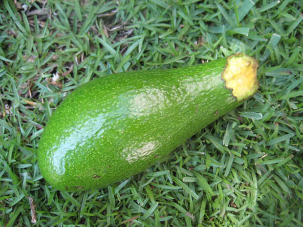 Se trata de un aguacate comido por una rata. Se sabe por las marcas del diente largo liso. Sólo se alimenta de la parte superior de la avo mientras está en el árbol, y entonces el avo cae al suelo.