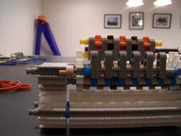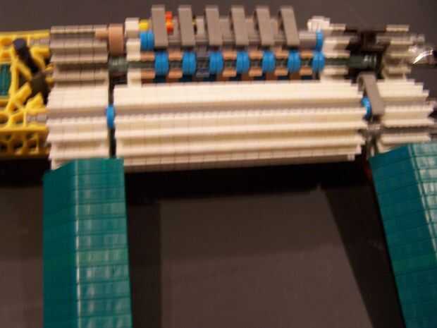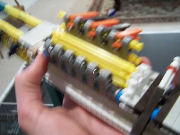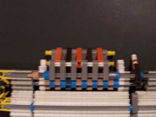 La tolva trabaja doblando sobre los conectores naranja y fijándolos deslizando piezas blancas a través de los conectores gris.