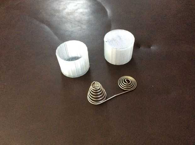 Doblado un bucle en el extremo de los resortes y y perforar un agujero en el extremo de las mitades de batería impreso 3d. Entonces utilicé pegamento caliente en el interior y fuera de este agujero para mantener la forma del resorte en su lugar. He presentado una ranura a cada lado de las mitades de la batería y caliente pegan la Asamblea.
