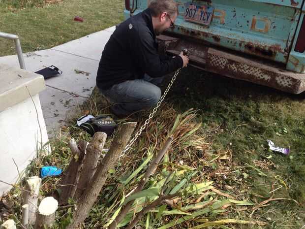 Una vez que ha tirado para arriba y "aflojó", puede conectar la cadena a un camión o un vehículo para tirar de él el resto de la salida. Usted podría hacer esto a mano, pero generalmente es bastante pesado ya que las raíces de la suciedad unida y puede ser bastante difícil de manejar. Como se mencionó anteriormente, es mejor levantar primero con el gato, y entonces se pueden lograr entre copas con su vehículo.