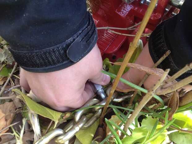 Para preparar la bush o muñón, todo lo que tienes que hacer es recortarlo suficientemente bajo como para que pueda caber el trípode sobre él (pero no demasiado bajo que no puede envolver una cadena alrededor de él). La idea es que usted enrolle la cadena alrededor de la base (tan baja como sea posible) del tocón o bush y luego fije el brazo de en la gato de la granja. He utilizado un gancho de metal pequeño que compré en la tienda de hardware para conectar la cadena a un agujero en el brazo del gato, pero otra vez, esto puede variar dependiendo de cómo se construye su gato.