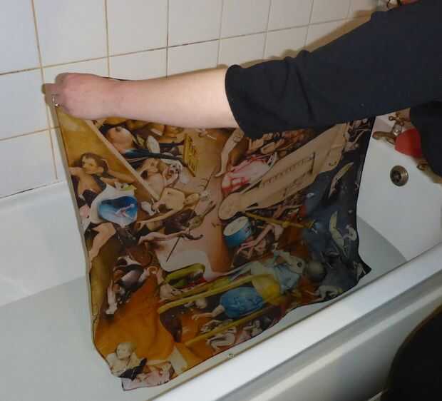 Suavemente frote el pañuelo en agua fría durante un par de segundos. Sacar y sacudir el agua suavemente (tanto como usted puede). Es muy importante no sacar el pañuelo como la seda es muy delicada!