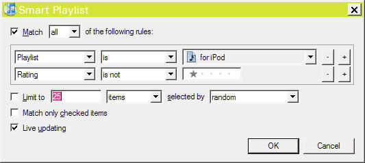 Eso es todo, haga clic en "Aceptar". Todo lo que queda es el nombre, un buen nombre para esta lista de reproducción es "sincronizar iPod". Esta lista de reproducción inteligente ahora contiene todo lo que es "Para iPod" pero nada de 1 estrellas.