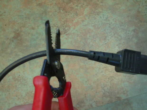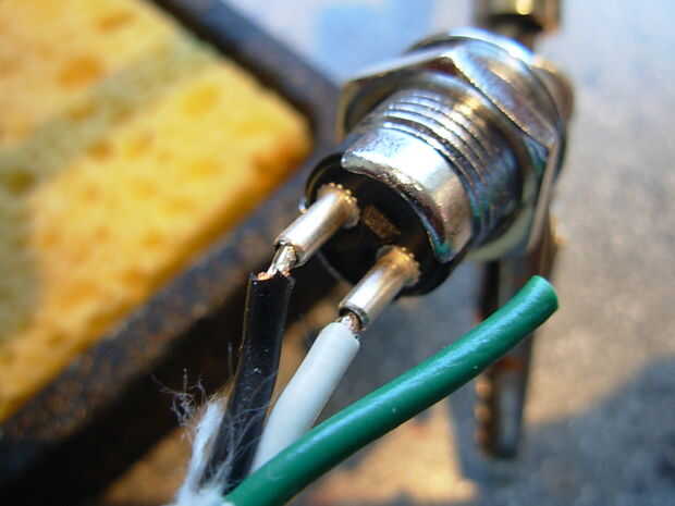 Comenzaremos con la preparación de los cables. Si usted utiliza un cable de alimentación de computadora como yo, lo primero que querrá hacer es cortar los extremos de tira lejos aproximadamente una pulgada de aislamiento externo, a continuación, sobre un 1/4 de pulgada de aislamiento individual. También debe pelar el cable de tierra (ignorar la nota contradictoria imagen). Hacer lo mismo en ambos extremos del cable. Por ahora, sólo utilizaremos uno de los extremos del cable de 115 voltios. A tal fin, aplicar una cantidad generosa de soldadura a lo de la lata. Luego inserte los cables en los conectores de barril de la llave. Mientras la calefacción para arriba de los conectores con el soldador, aplicar soldadura para los cables donde se Contacta con los conectores. También, conecte el cable de tierra a la carcasa metálica del interruptor. Si algo falla, esto lo protegerá de una descarga eléctrica.