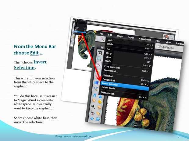 Haga clic en Editar de la barra de menú y elija Invertir selección. Esto ahora tapa la línea de puntos para ser alrededor de la imagen (en este caso el elefante).